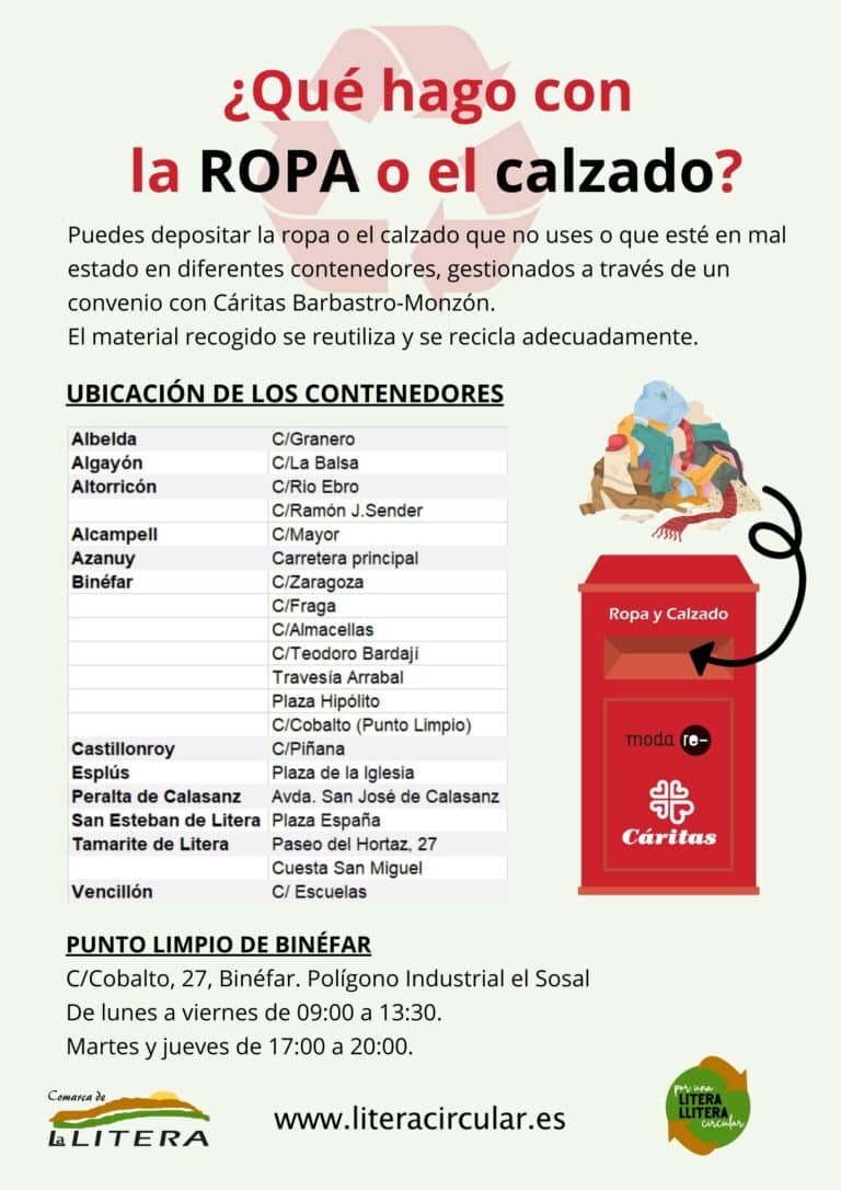 Puedes depositar la ropa o el calzado que no uses o que esté en mal estado en diferentes contenedores, gestionados a través de un convenio con Cáritas Barbastro-Monzón.