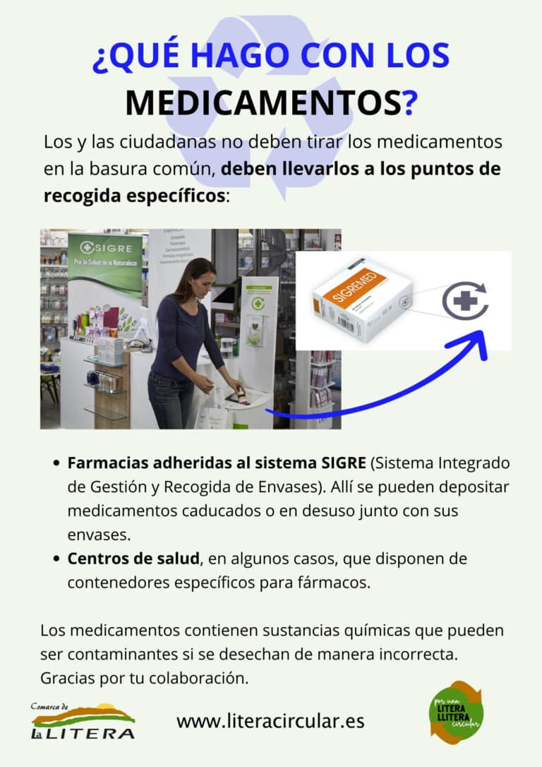 Medicamentos: Los residuos de medicamentos disponen de un sistema de recogida separada específica, mediante contenedores habilitados (denominados puntos SIGRE) que se encuentran en las farmacias.